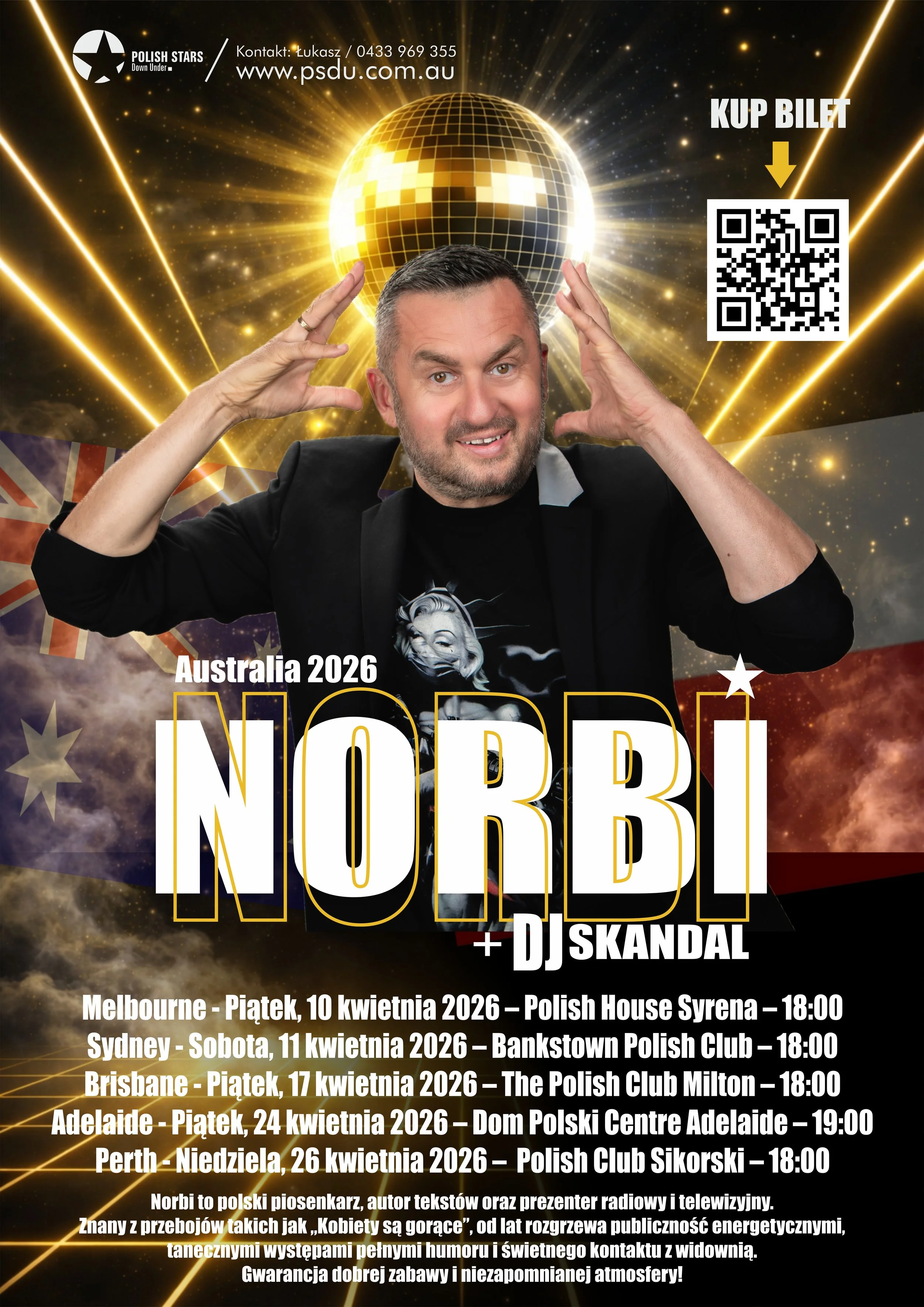 Po latach sukcesów scenicznych Norbi odwiedzi Australię z energetycznym koncertem w stylu Euro Disco, pełnym największych przebojów, tanecznych rytmów i doskonałego kontaktu z publicznością.